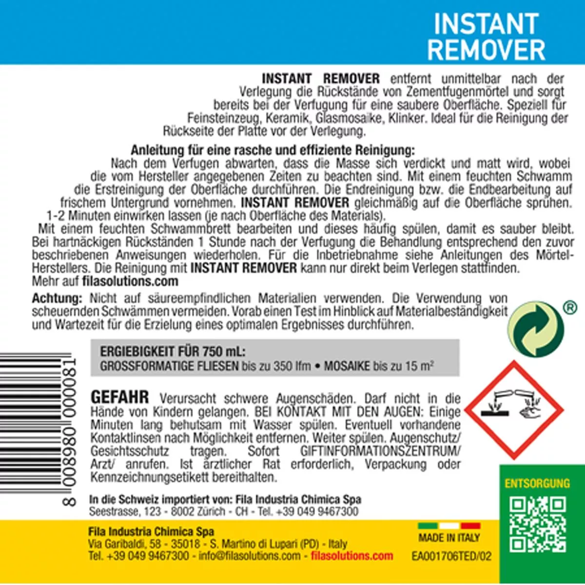 Fila INSTANT REMOVER καθαριστικό για τσιμεντοκονία 750 ML