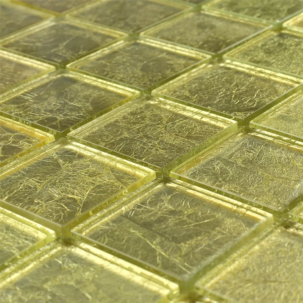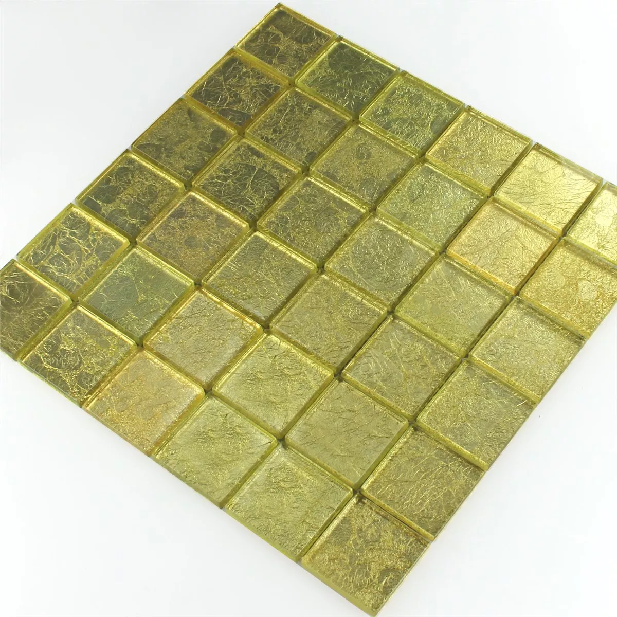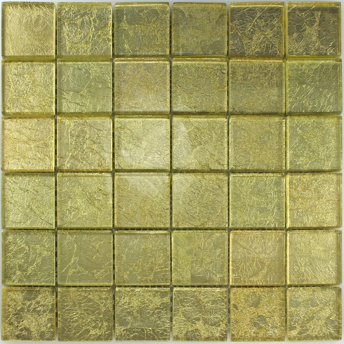 Το μωσαϊκό γυαλιού 8mm Gold Metal Light είναι ένα μωσαϊκό από γυαλί με εφέ που μπορεί να στρωθεί ως πλακάκι. Ένα εξαιρετικά κομψό ύφος που δημιουργεί ένα λαμπερό αποτέλεσμα στο δωμάτιο. Το εφέ μωσαϊκού από γυαλί, σε χρώμα χρυσό φως και γυαλιστερή υφή επιφάνειας, έχει μέγεθος ψάθας 30x30cm και μέγεθος πέτρας 4,8x4,8mm. Το πάχος των μεμονωμένων λίθων είναι 0,8 cm.