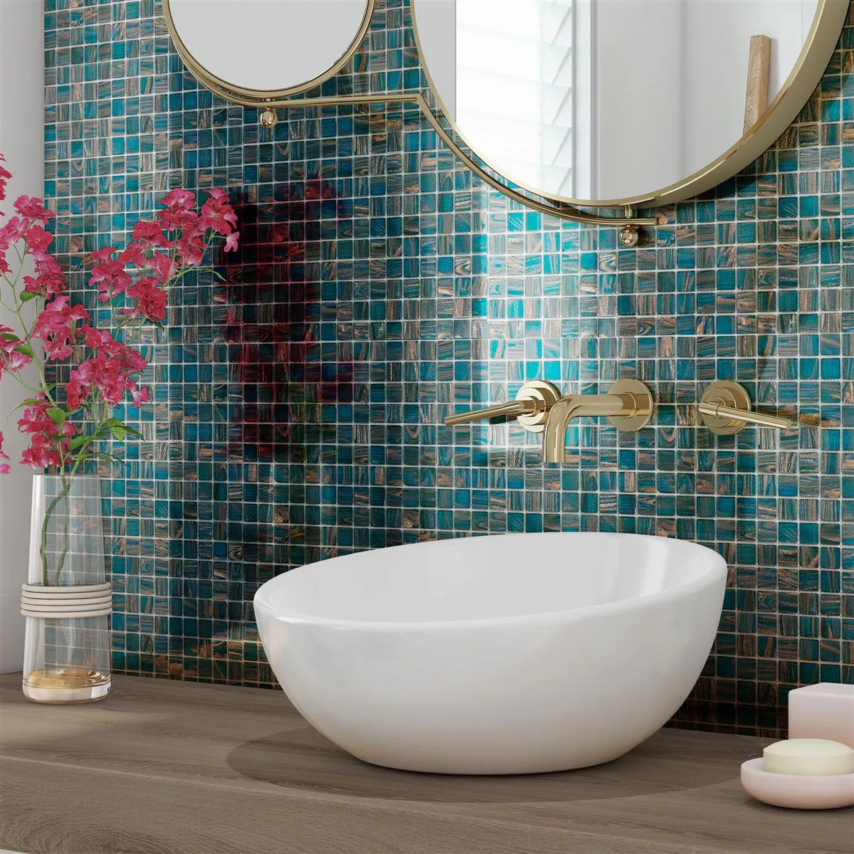 Ιδανικά για μπάνια, κουζίνες, εσωτερικούς χώρους και ντους, αυτά τα πολυχρηστικά πλακάκια είναι ειδικά σχεδιασμένα για υγρούς χώρους. Δώστε στο δωμάτιό σας έναν ήρεμο αλλά εντυπωσιακό συνδυασμό χρωμάτων με τα γυάλινα μωσαϊκά πλακάκια Kyoto Petrol Blue.