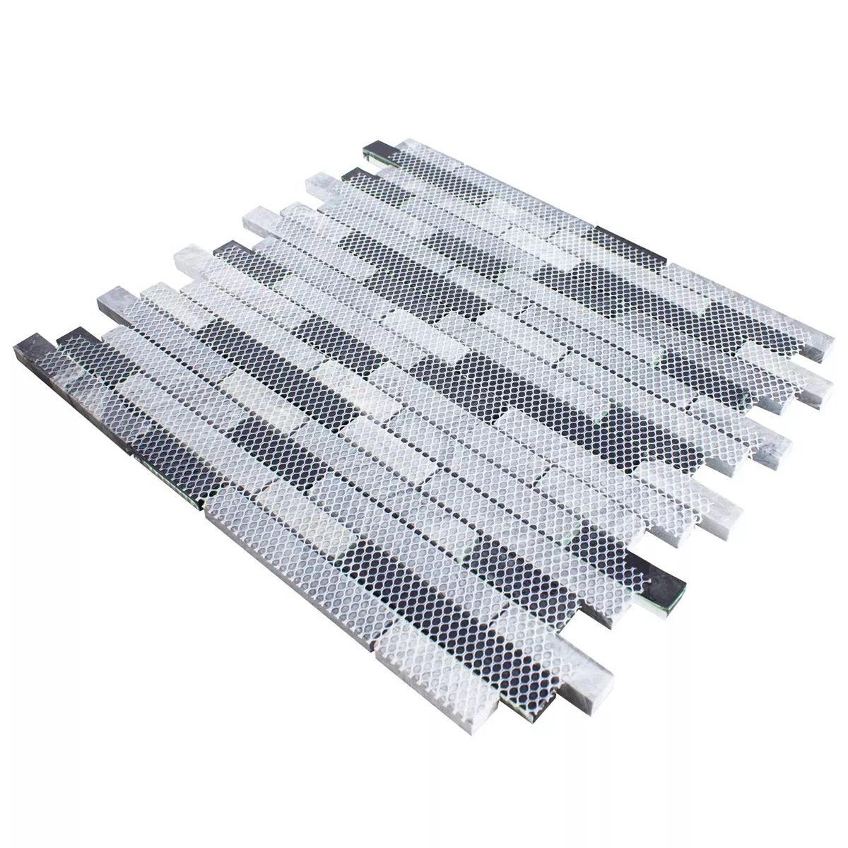 Με μια γυαλιστερή, γυαλισμένη επιφάνεια, το πλακάκι δίνει σε κάθε δωμάτιο μια κομψή εμφάνιση. Τα μεγέθη της πέτρας ποικίλλουν μεταξύ 15 x 48 mm και 15 x 98 mm, γεγονός που, μαζί με τη μορφή σχεδίασης ραβδιού και ορθογωνίου, δημιουργεί ελκυστική υφή και οπτικό βάθος. Το πάχος του πλακιδίου είναι 8mm και κάθε χαλάκι έχει διαστάσεις 29 x 30cm, καλύπτοντας μια επιφάνεια 0,087m².