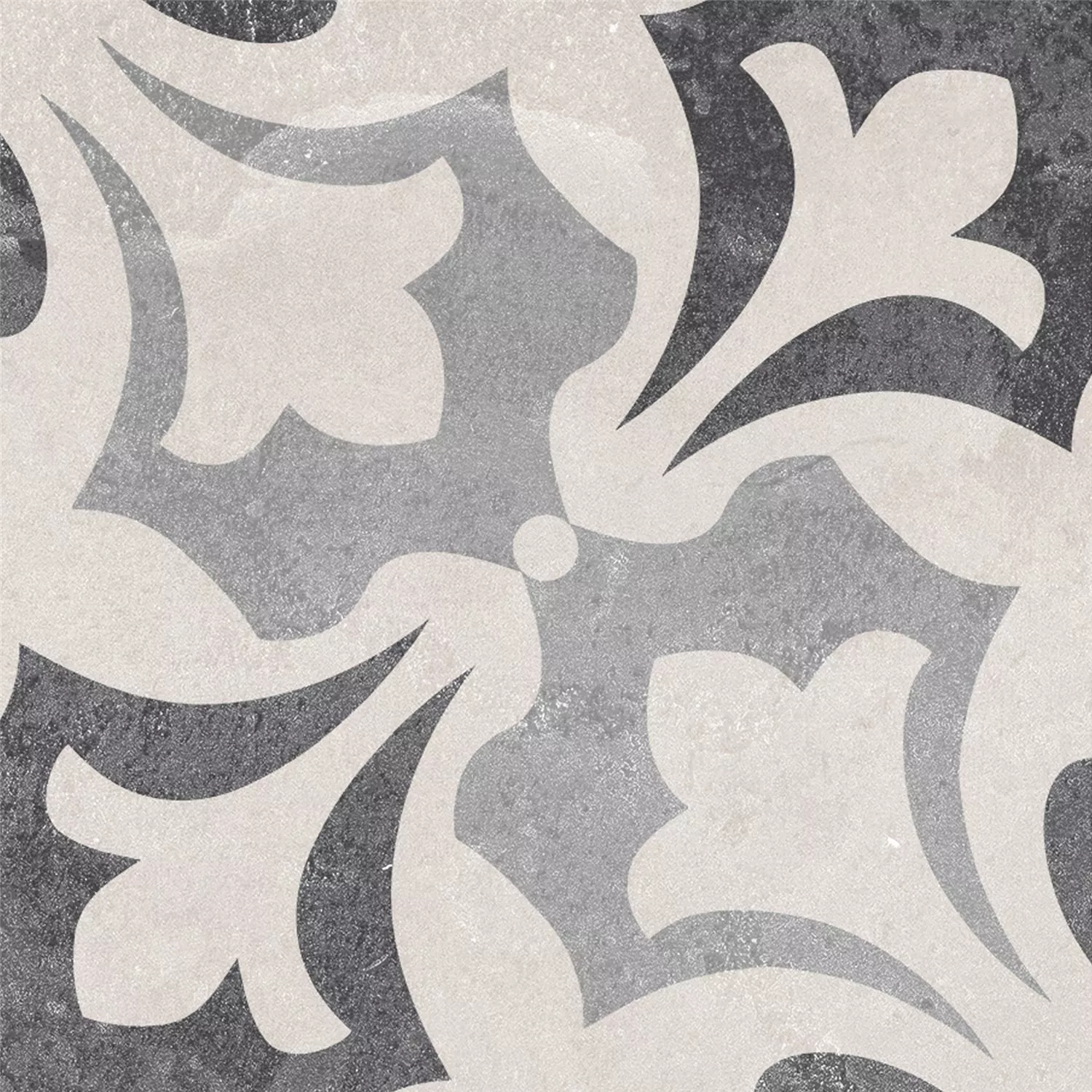 Τα τσιμεντένια πλακάκια 18,6x18,6 εκ. σε ρετρό εμφάνιση έχουν μαύρα φλοράλ στολίδια σε σειρά σε σκούρο γκρι φόντο. Τα πλακάκια τσιμέντου είναι κατάλληλα για θέρμανση δαπέδου, τζάμια, ματ και 11mm.