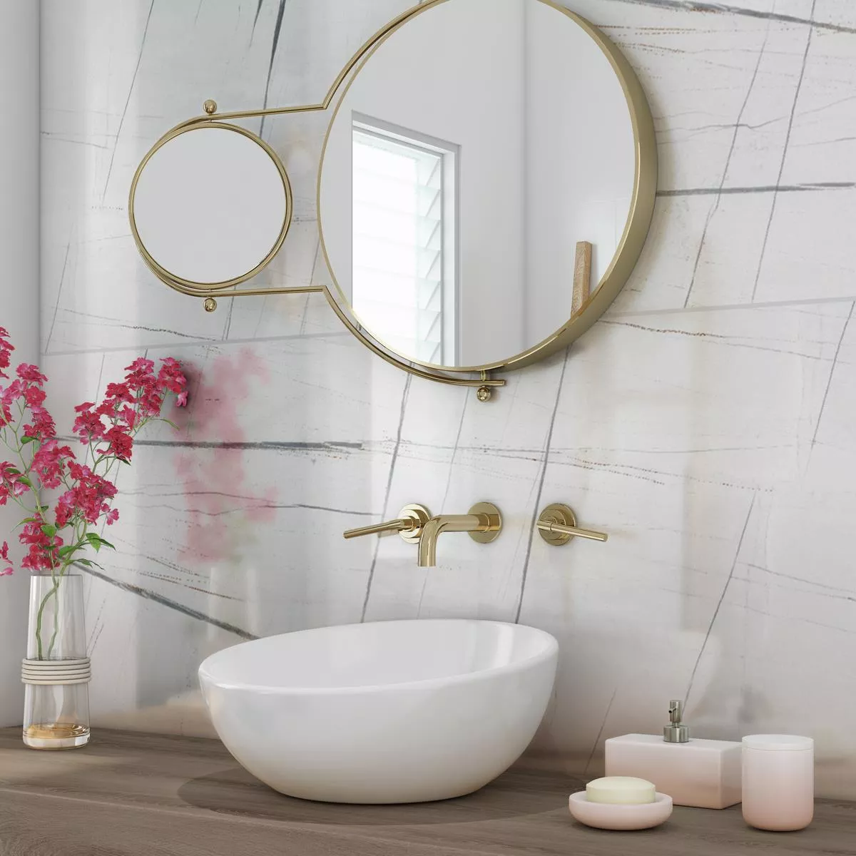 Τα πλακάκια σε όψη μαρμάρου εντυπωσιάζουν με τη γυαλισμένη, γυαλιστερή τους επιφάνεια, η οποία δημιουργεί μια εκλεπτυσμένη και διαχρονική εμφάνιση. Με μέγεθος 60x120cm και πάχος 9mm, προσφέρουν ένα γενναιόδωρο σχήμα που δίνει σε κάθε δωμάτιο μια κομψή και ανοιχτή ατμόσφαιρα. Η μία συσκευασία καλύπτει επιφάνεια 1,44m² και περιέχει 2 πλακάκια.