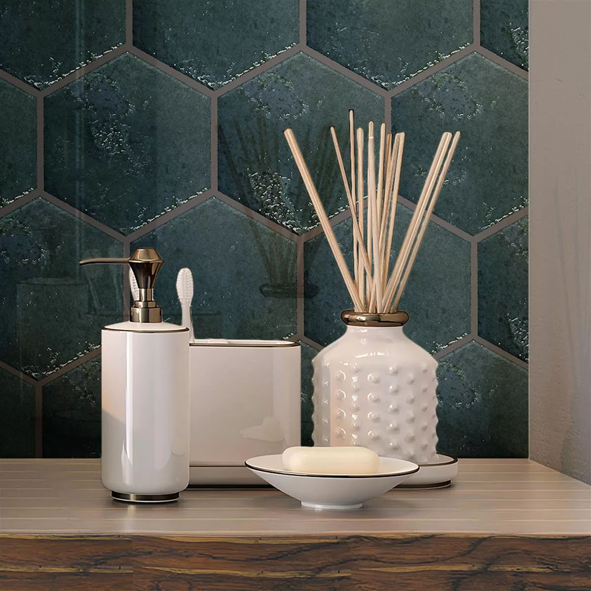 Με πάχος 7 mm, το πλακάκι είναι στιβαρό και ιδανικό για διάφορους χώρους χρήσης όπως μπάνια, ντους, κουζίνες και σαλόνια. Η εξαγωνική μορφή (13 x 15 cm) επιτρέπει τη δημιουργική σχεδίαση και εξασφαλίζει ένα κομψό, γεωμετρικό σχέδιο.