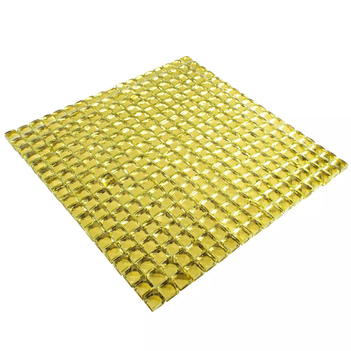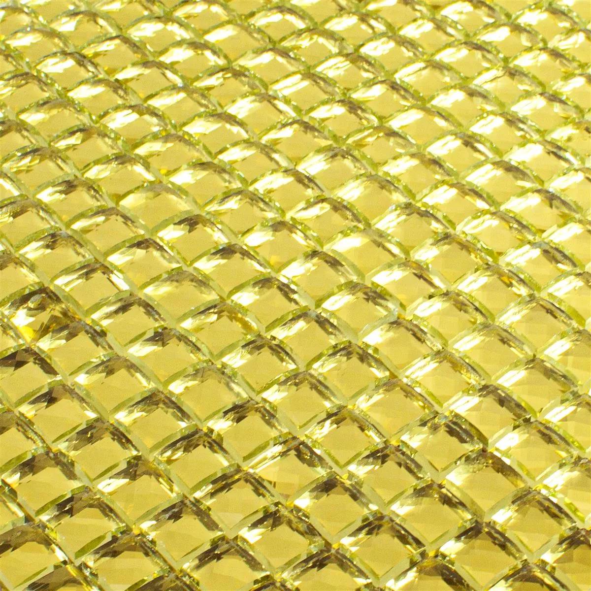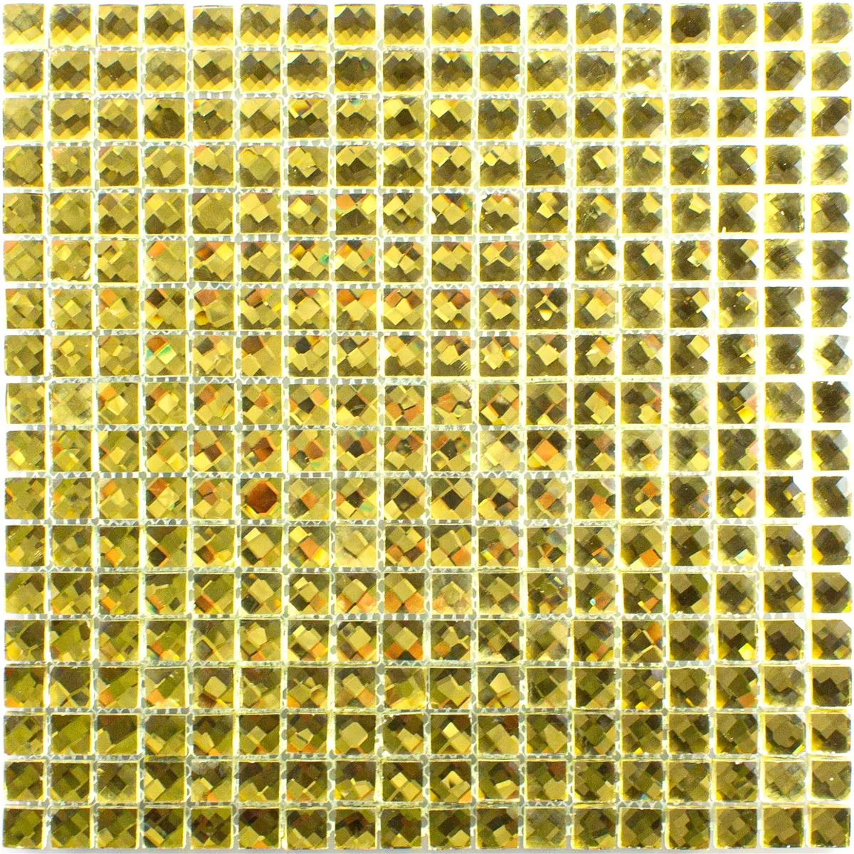 Τα πλακάκια είναι σε πολυτελή χρυσό τόνο και είναι κατασκευασμένα από γυαλί υψηλής ποιότητας. Η γυαλιστερή επιφάνεια και η εντυπωσιακή 3D εμφάνιση δίνουν σε κάθε δωμάτιο ένα ιδιαίτερο βάθος και αντανάκλαση φωτός. Κάθε πλακίδιο έχει μέγεθος πέτρας 15 x 15 mm και πάχος 8 mm. Το στρώμα πλακιδίων έχει διαστάσεις 30 x 30 cm και καλύπτει επιφάνεια 0,090 m².