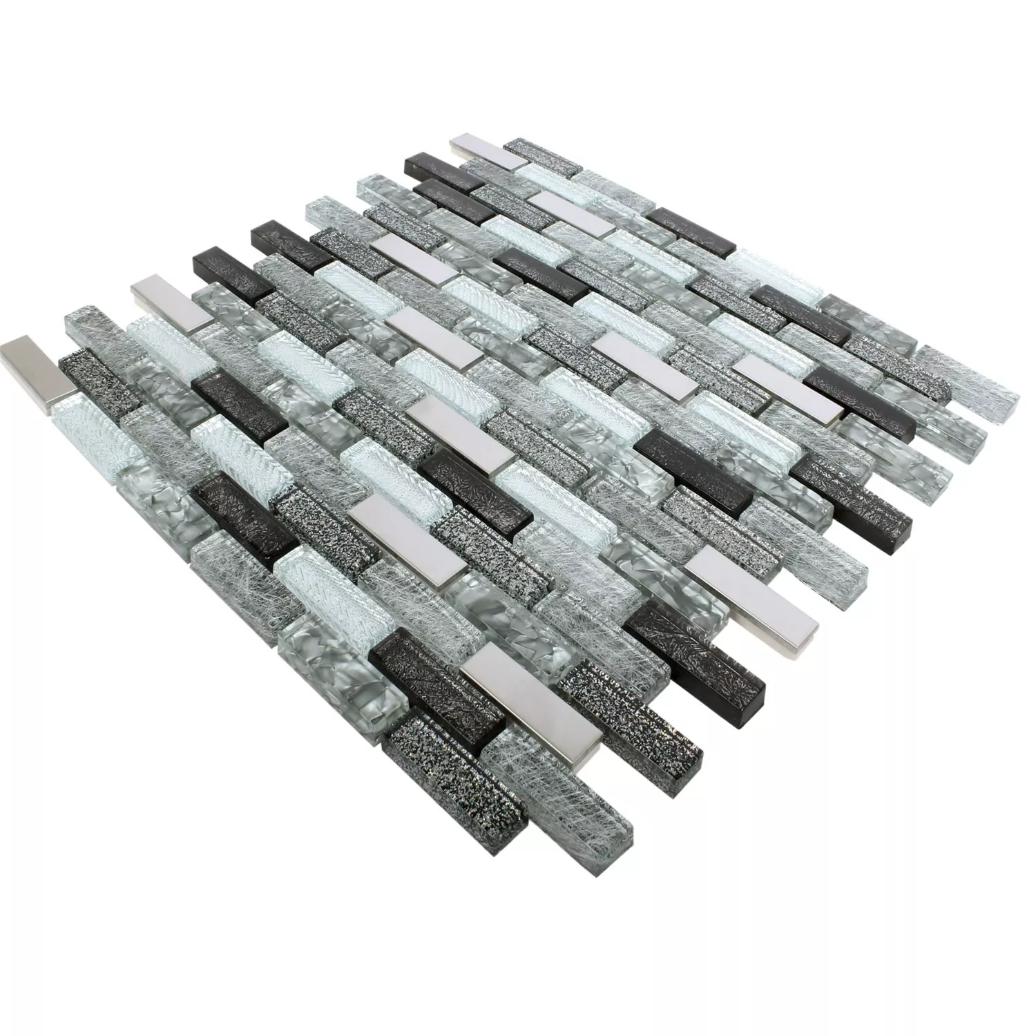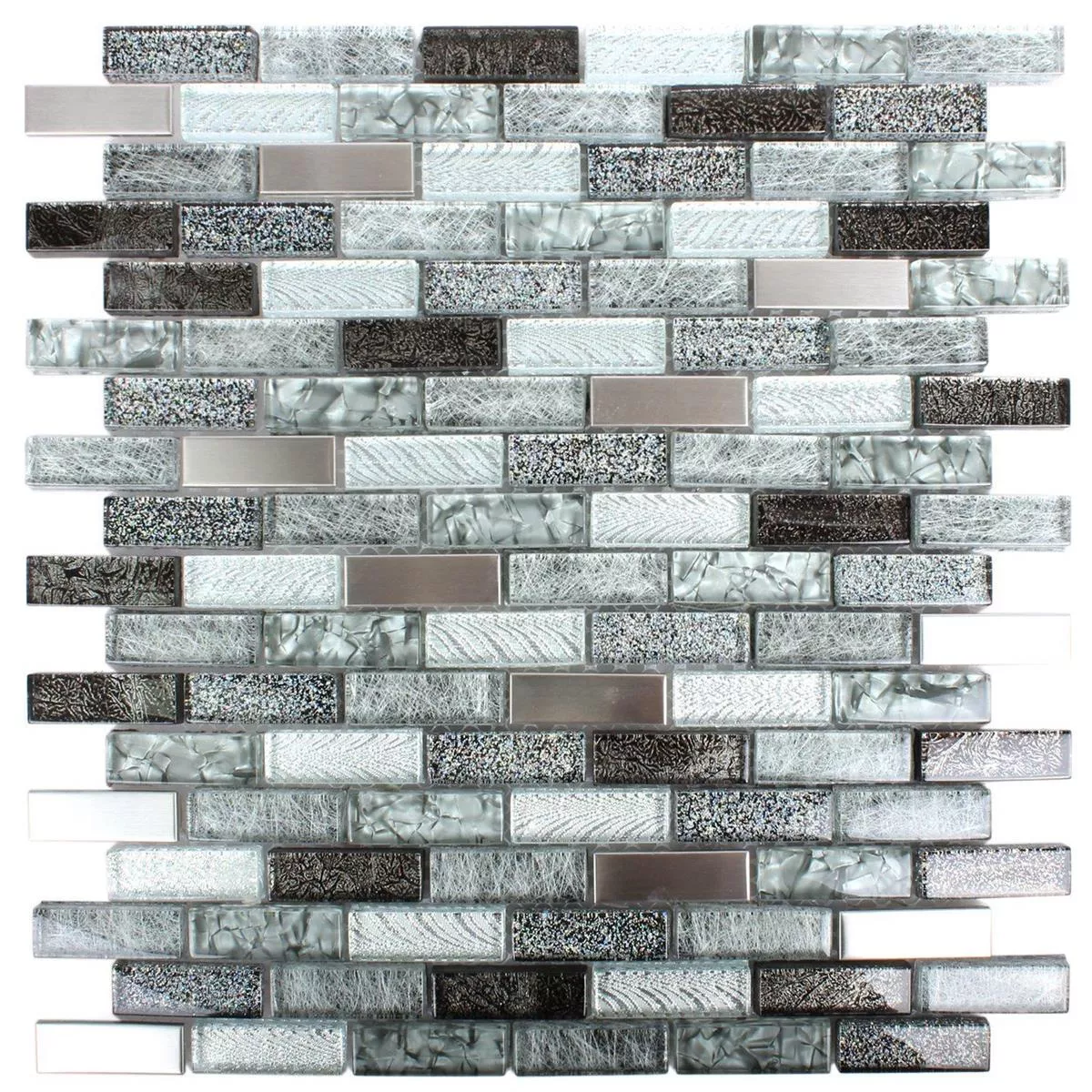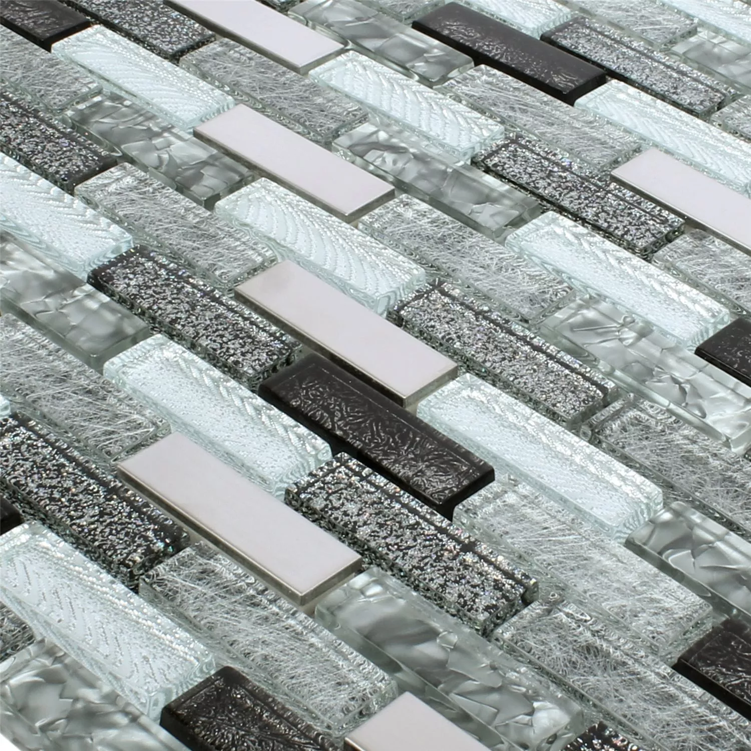 Τα ορθογώνια μεταλλικά και γυάλινα μωσαϊκά πλακάκια είναι το τέλειο υλικό για την κάλυψη τοίχων. Η μαύρη και γκρι επιφάνεια από γυαλί και μέταλλο το καθιστά ιδανικό για αυτό. Ωστόσο, δεν είναι σχεδιασμένα για υγρές περιοχές.